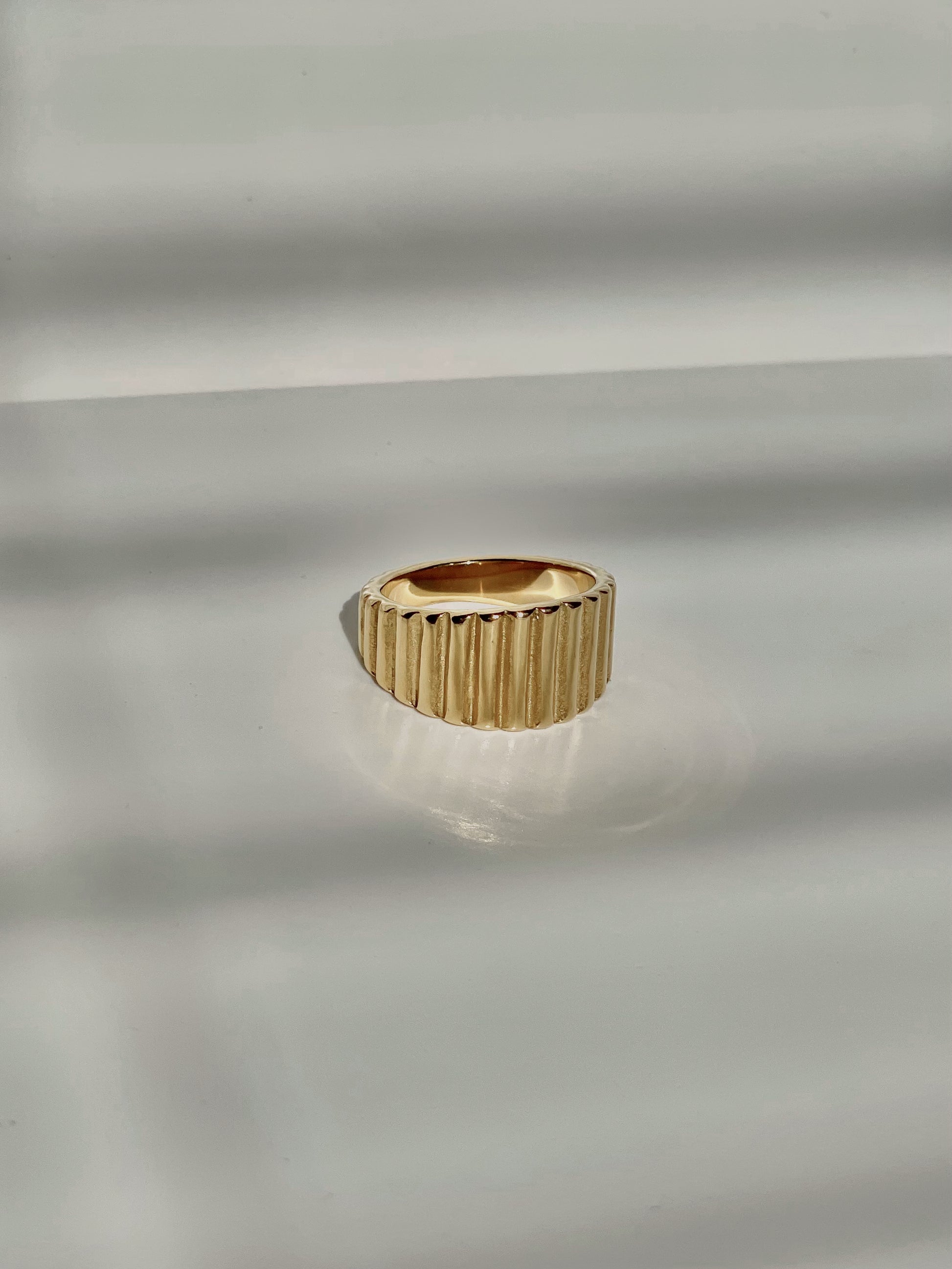 Thick gold ring with vertical stripe engravings.